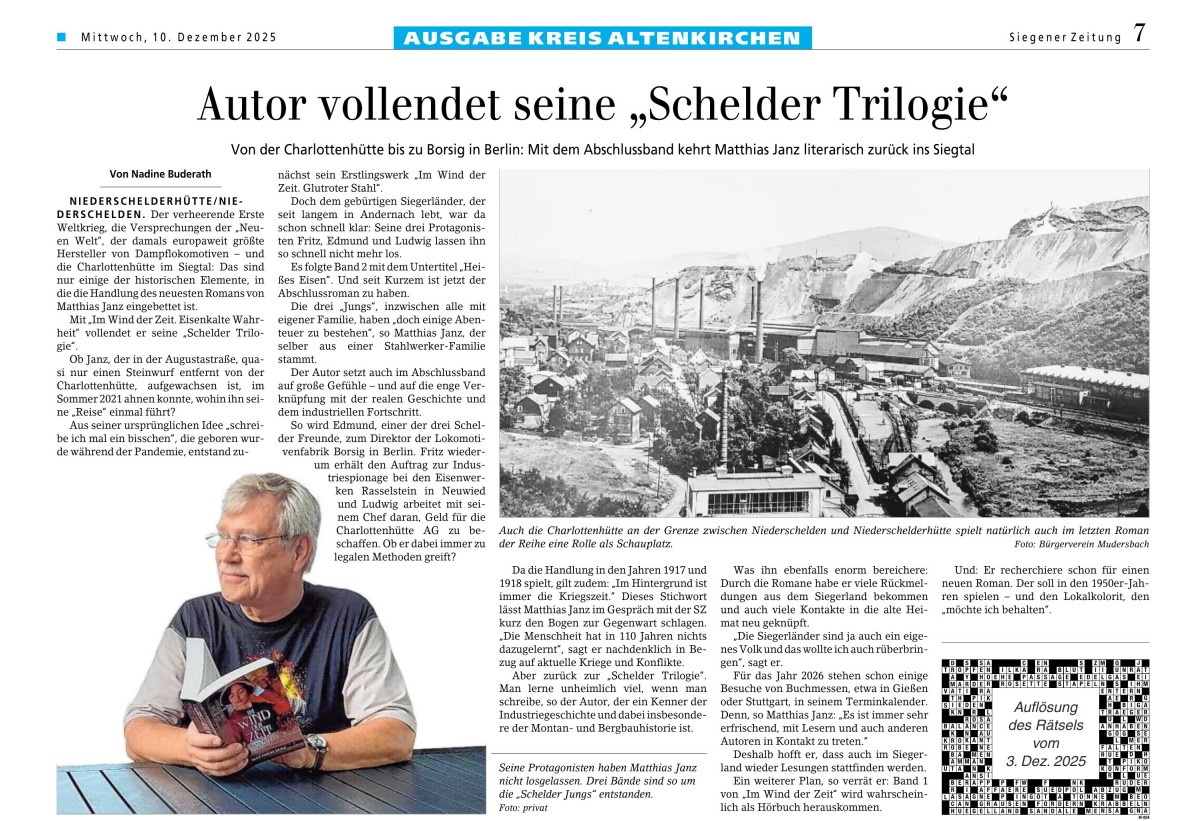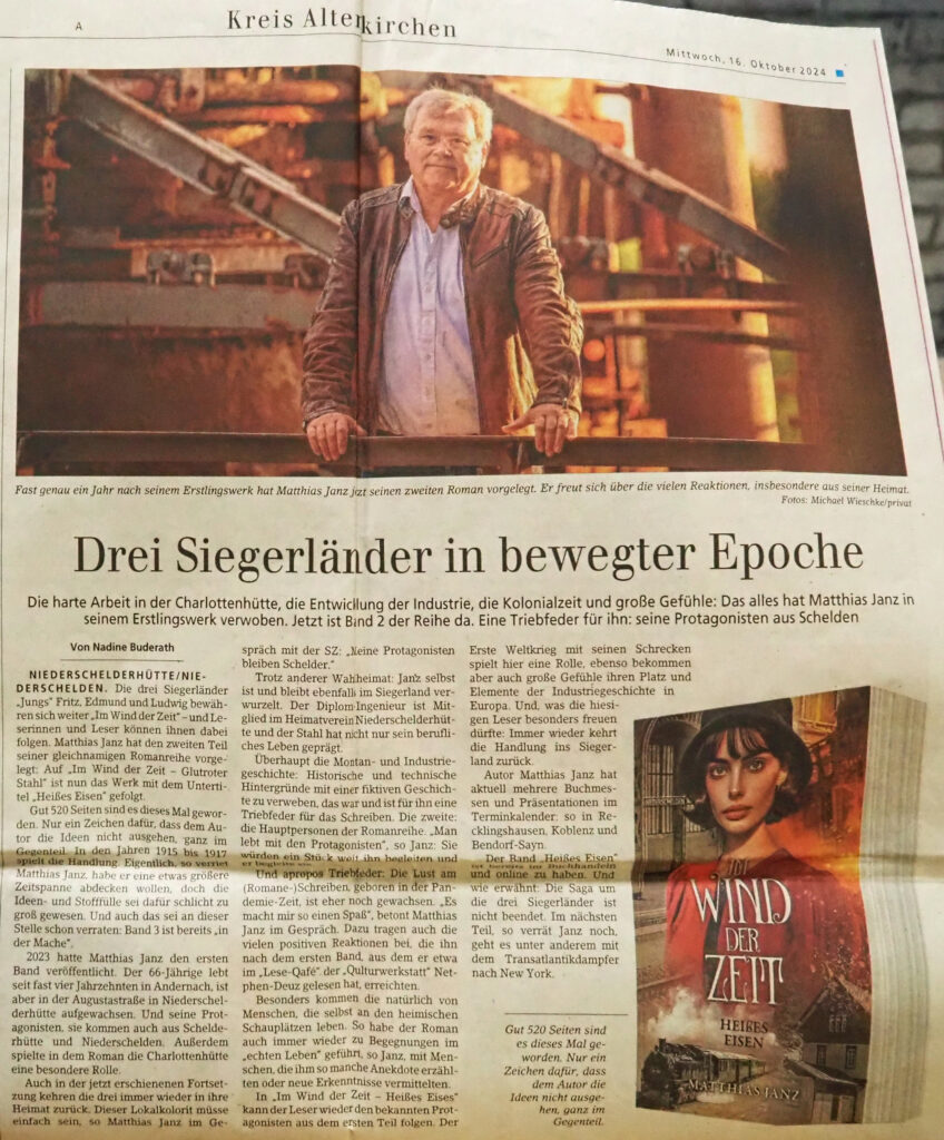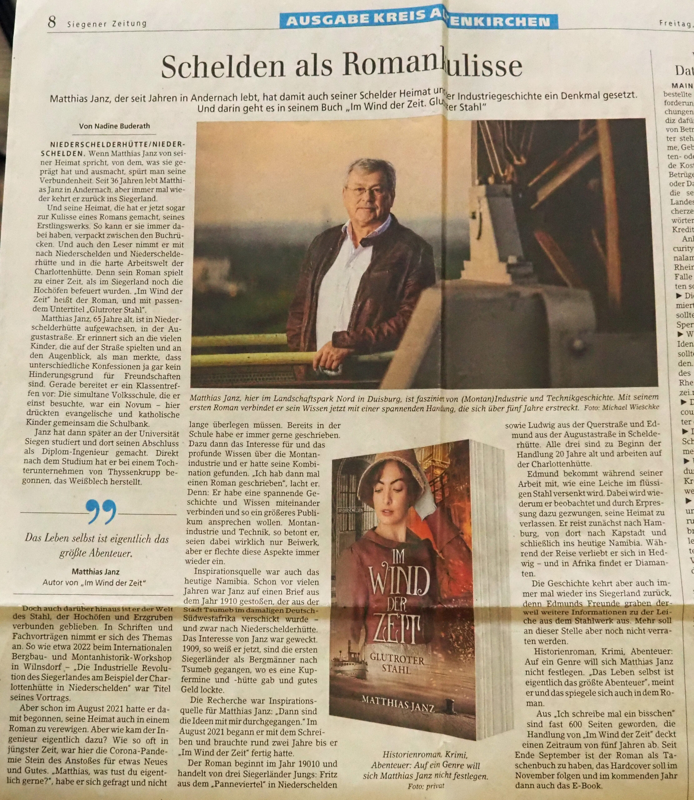Sein Romandebüt „Im Wind der Zeit – Glutroter Stahl“ startet in einem Hüttenwerk im Siegerland. Die Umstände führen die Protagonisten in weite Fernen zu abenteuerlichen Erlebnissen.